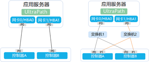 直连方式:每个控制器至少一个前端端口与应用服务器直连,保证链路冗余,UltraPath多路径自动计算最优路径。