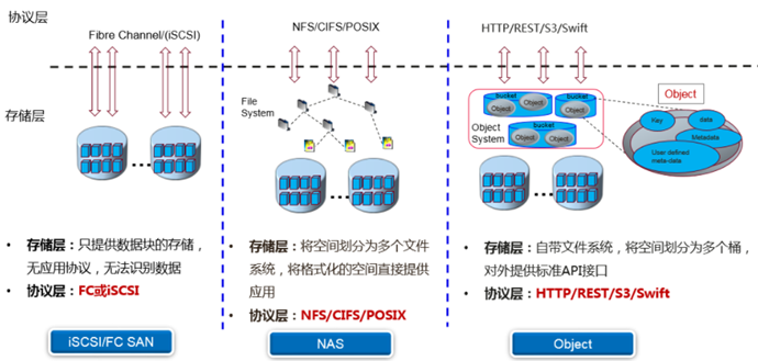 - 协议层:集中式存储可实现块及文件的统一存储架构,所以前端需要配置协议层实现SAN/NAS协议分离。