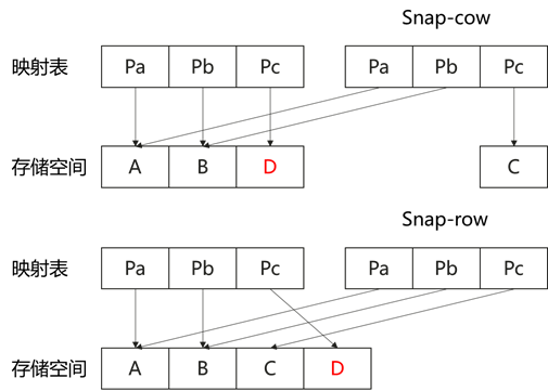 如下图所示,源LUN上存储数据块“ABC”,此状态下打了一次快照,源LUN指针映射表复制给块照。当源LUN中数据块C需要修改为D时,COW方案下,数据块C复制到独立的COW快照卷中;ROW方案下,快照映射表不动,数据块D存储到新的空间中,并将指针指向新的存储空间。
