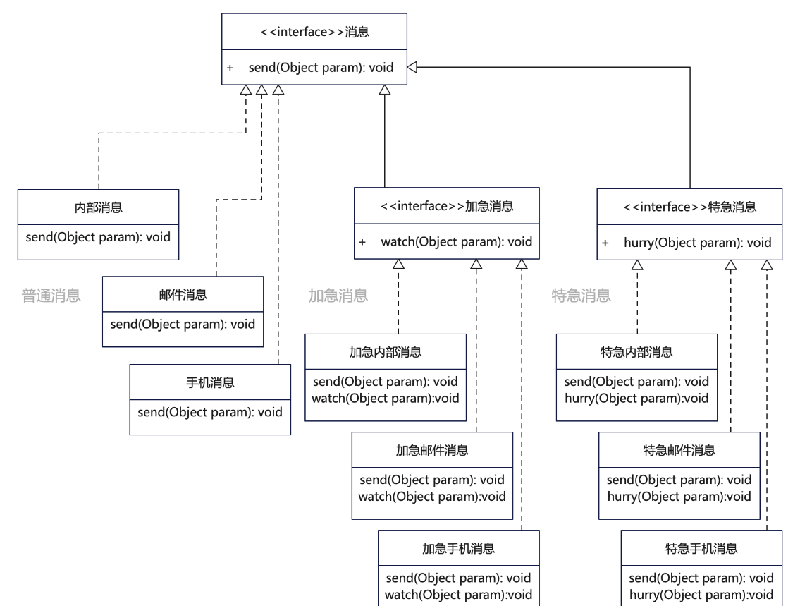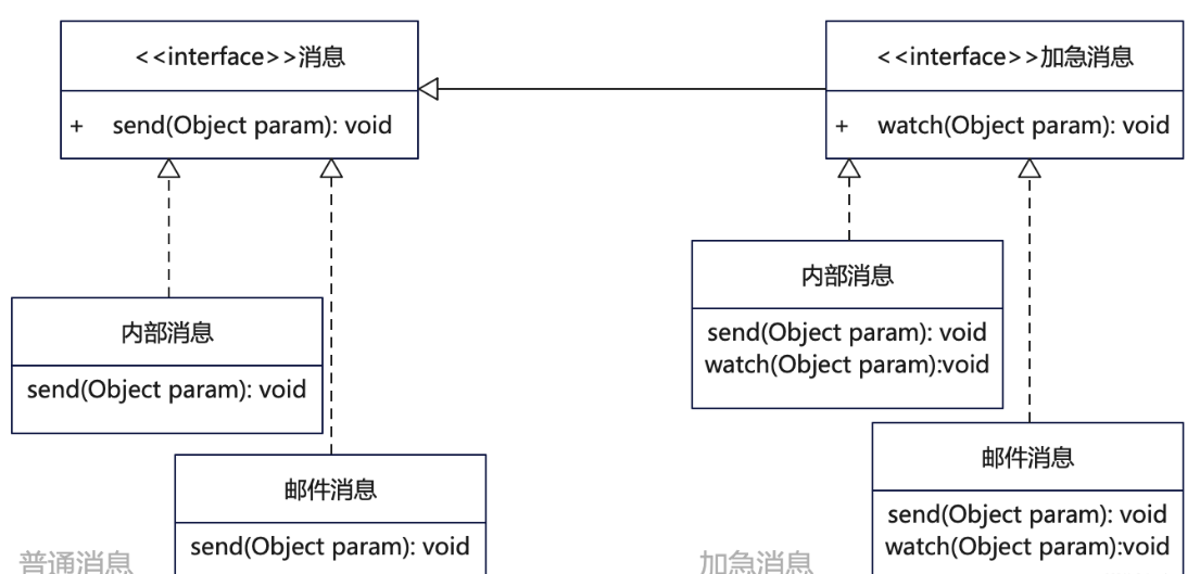 对于出现变化因素有两类的,也就是有两个变化纬度的情况,继承实现就会比较痛苦。比如上面的示例,就有两个变化纬度, 一个是消息的类别,不同的消息类别处理不同;另外一 个是消息的发送方式。