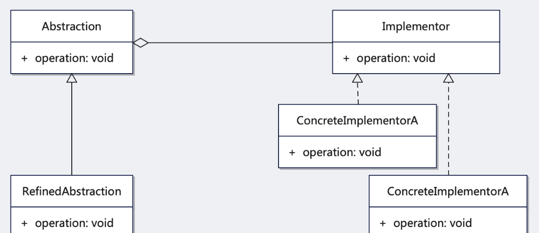 ConcreteImplementor(具体实现部分):该部分是实现部分接口的具体实现,提供了实现部分的具体操作。