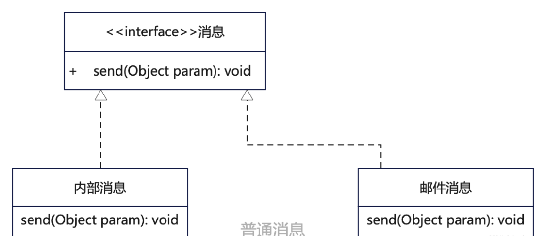 发普通消息舒服两种不同的实现方式,为了让外部能统一操作,因此把消息设计成接口,然后由两个不同的实现类分别实现系统内部消息方式和邮件消息的方式。