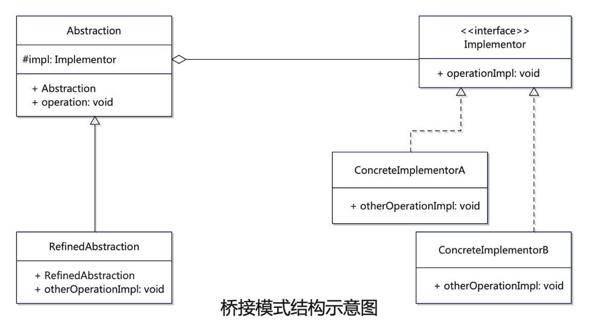 在桥接模式中,Abstraction充当抽象部分的角色,它包含对Implementor的引用;RefinedAbstraction是Abstraction的子类,扩展了Abstraction中定义的接口;Implementor定义了实现部分的接口,而ConcreteImplementor是Implementor的具体实现。