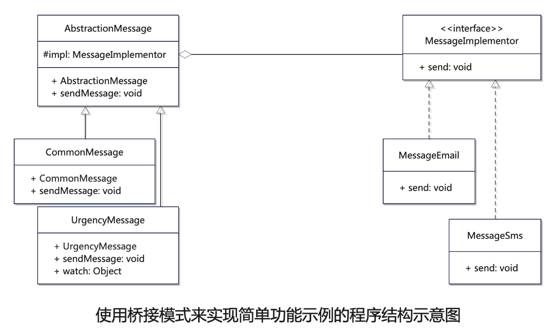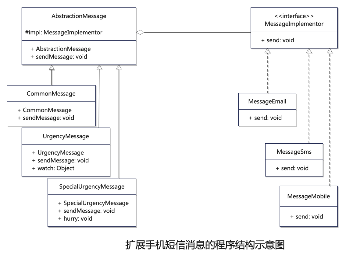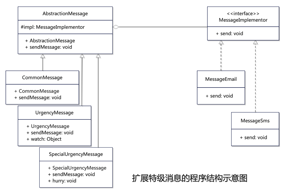 从另外一个角度看,抽象部分和实现部分没有固定的绑定关系,因此同一个真实实现可以被不同的抽象对象使用;反过来,同一个抽象也可以有多个不同的实现。就像前面示例的那样,比如,内部消息的实现功能,可以被普通消息、加急消息或是特急消息等不同的消息对象使用;反过来,某个消息具体的发送方式,可以是内部消息或者是E-mail,也可以是手机短消息等具体的发送方式。