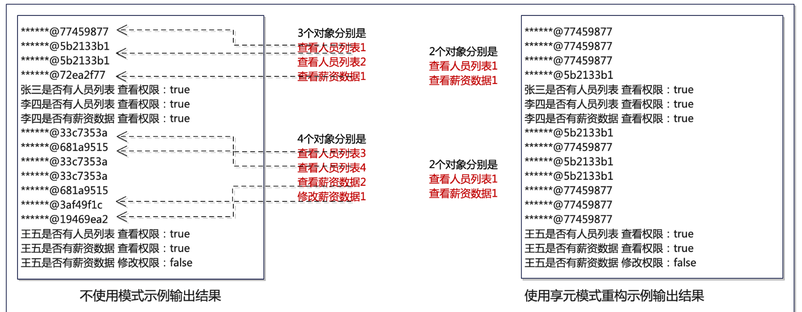 从输出中看出,使用享元模式重构示例之后输出的对象信息中,相同的权限数据为同一个对象,即只有“人员列表,查看” 和 “薪资数据,查看” 两个对象,实现了权限数据的共享。