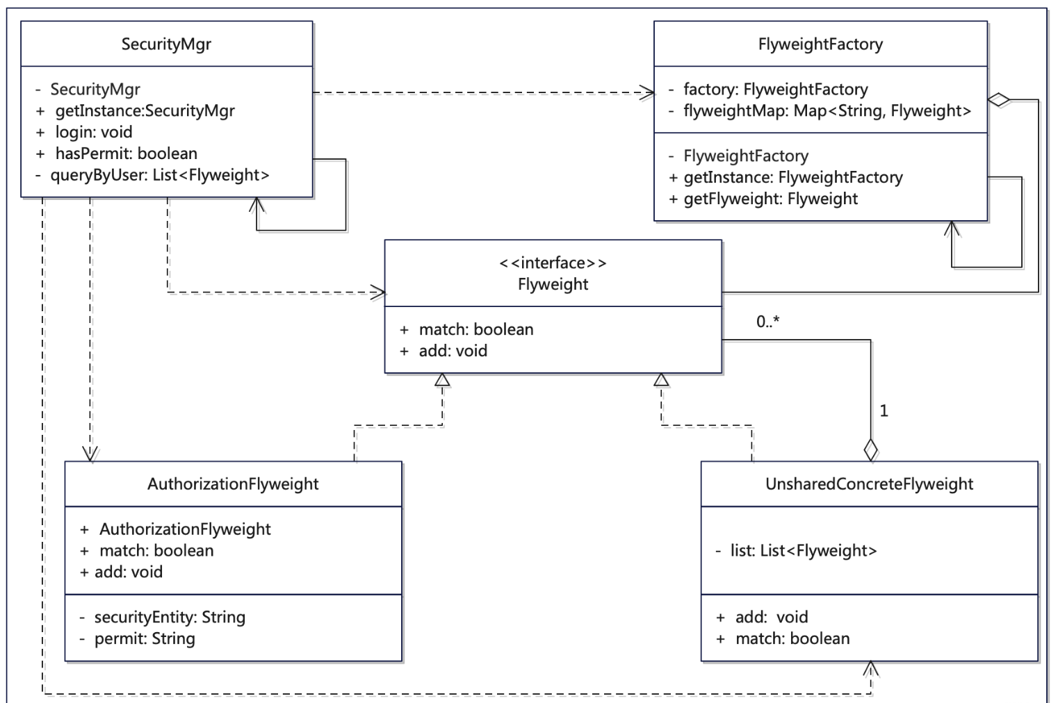 使用享元对象,按照前面的实现,需要一个对象来提供安全管理的业务功能,即 SecurityMgr 类,这个类现在在享元模式中充当了 Client 的角色。有点变化如下