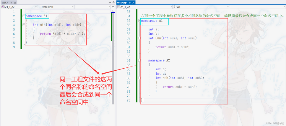 命名空间可以定义在几个不同的部分,同一个工程中允许存在多个相同名称的命名空间,编译器最后会合成同一个命名空间中: