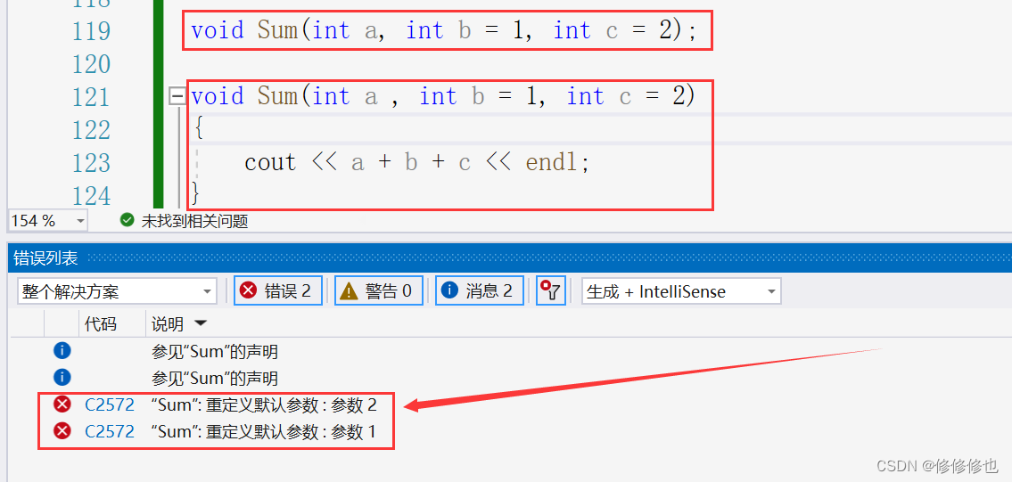 如下函数Sum_2,如果函数既有未被指定缺省值的参数,又有被指定缺省值的参数,那么该函数就被称为半缺省参数:
