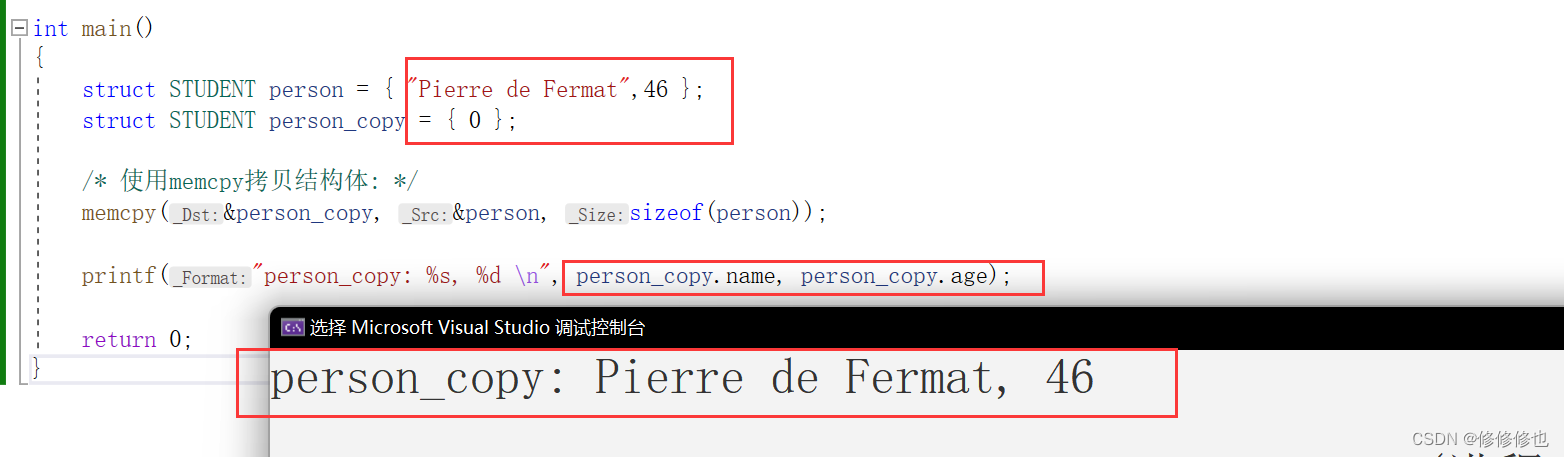 如下,我们使用memcpy()函数将结构体变量person的数据拷贝进person_copy中: