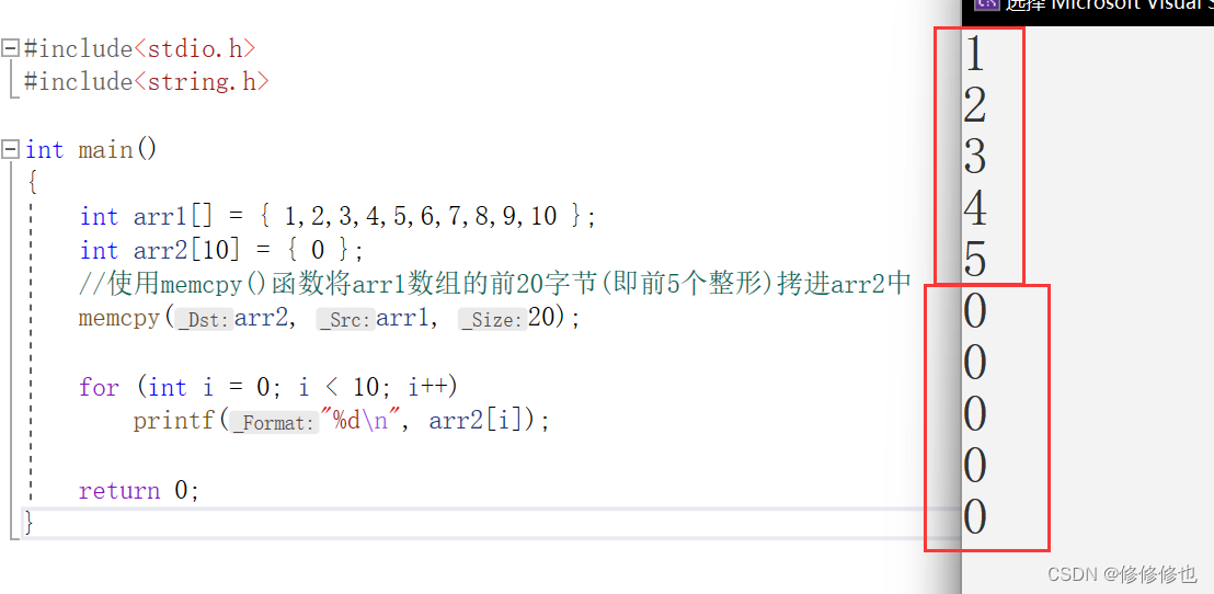 如下,我们使用memcpy()函数将arr1数组的前20字节(即前5个整形)拷贝进arr2中:
