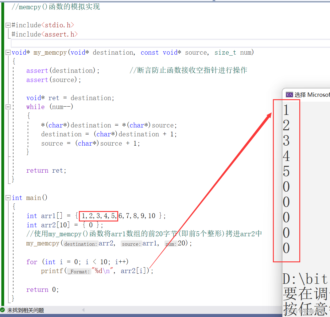 //使用my_memcpy()函数将arr1数组的前20字节(即前5个整形)拷进arr2中