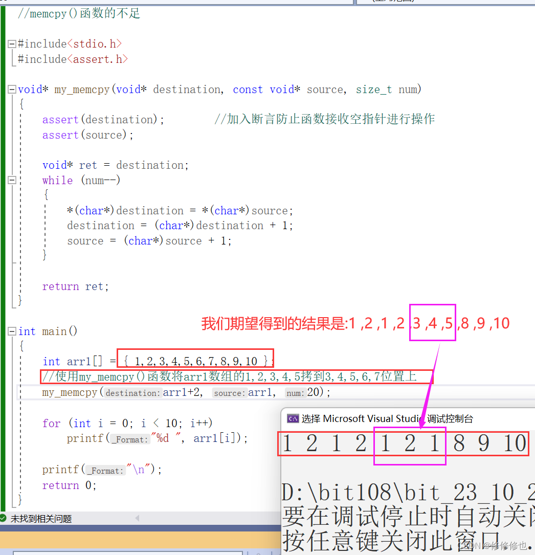 又测试了一下模拟实现函数my_memcpy()函数在面对该问题时的处理结果: