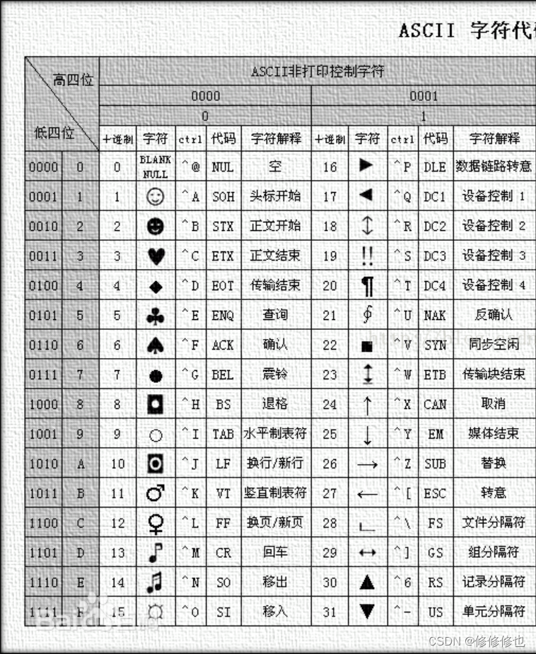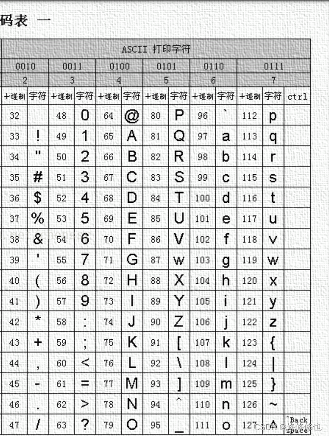而控制字符包括下表中的所有字符,即从'NUL'到'US'。并且还包含ASCII码值为127的'DEL'字符。