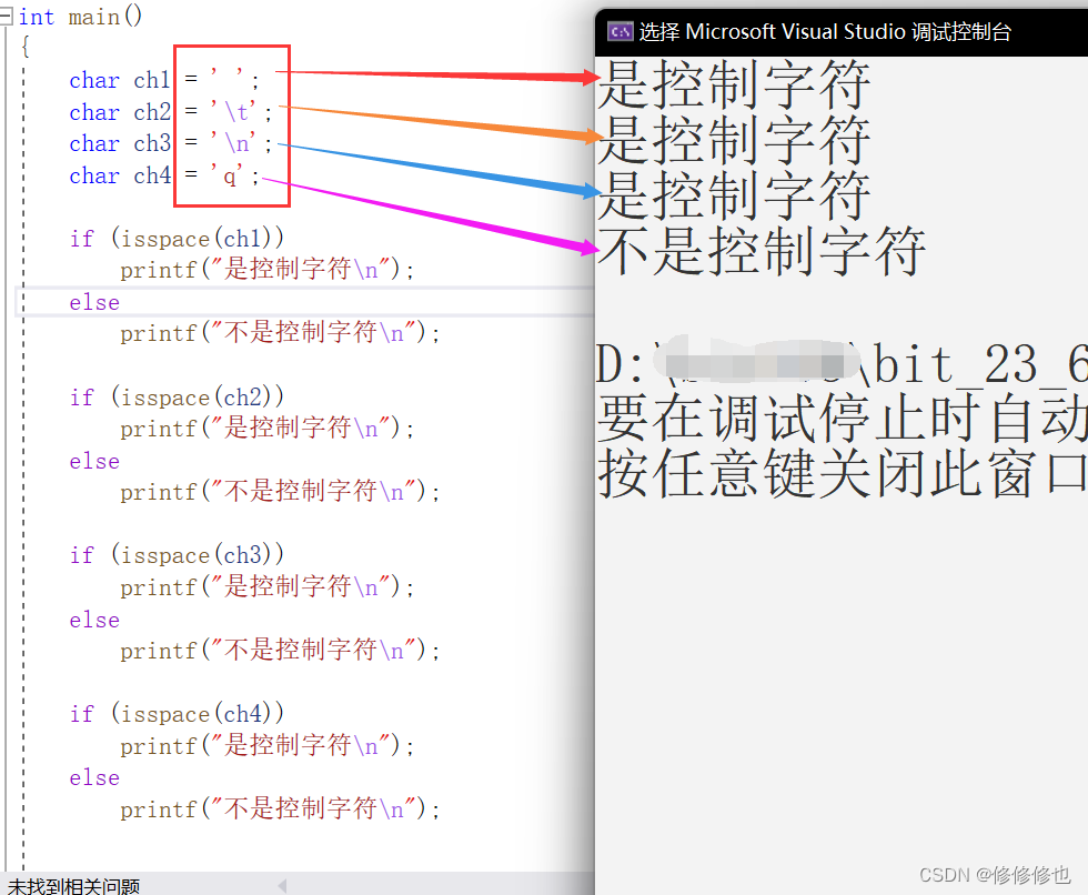 综上可知,当你向iscntrl()函数传输一个字符(实际是它的ASCII值)时,它会判断其是否是控制字符,包括回车符、换行符、制表符等,如果是,它会返回给你一个非零的数,如果不是,则会返回0。