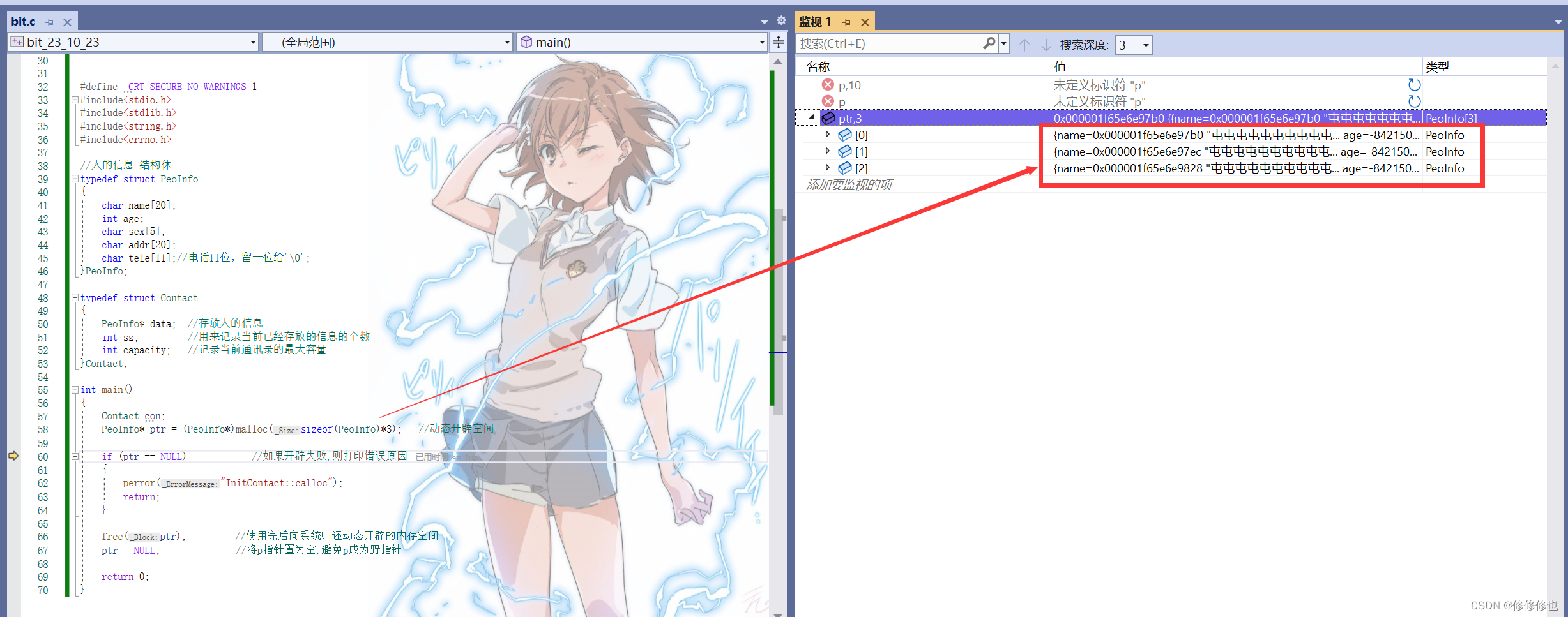 创建好结构体变量后,我们给malloc()函数传入:sizeof(PeoInfo)*3(即3个PeoInfo类型大小的字节数).