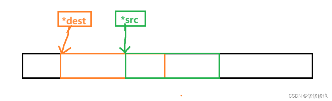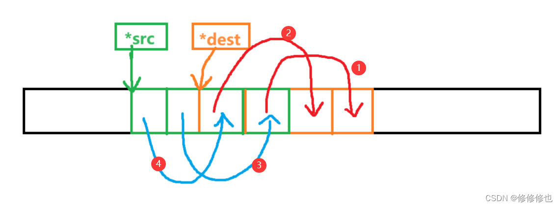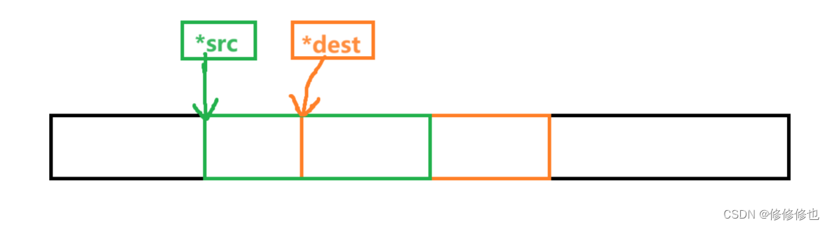 注:以下演示中,*src指针指向源头起始内存块,*dest指针指向目标起始内存块.