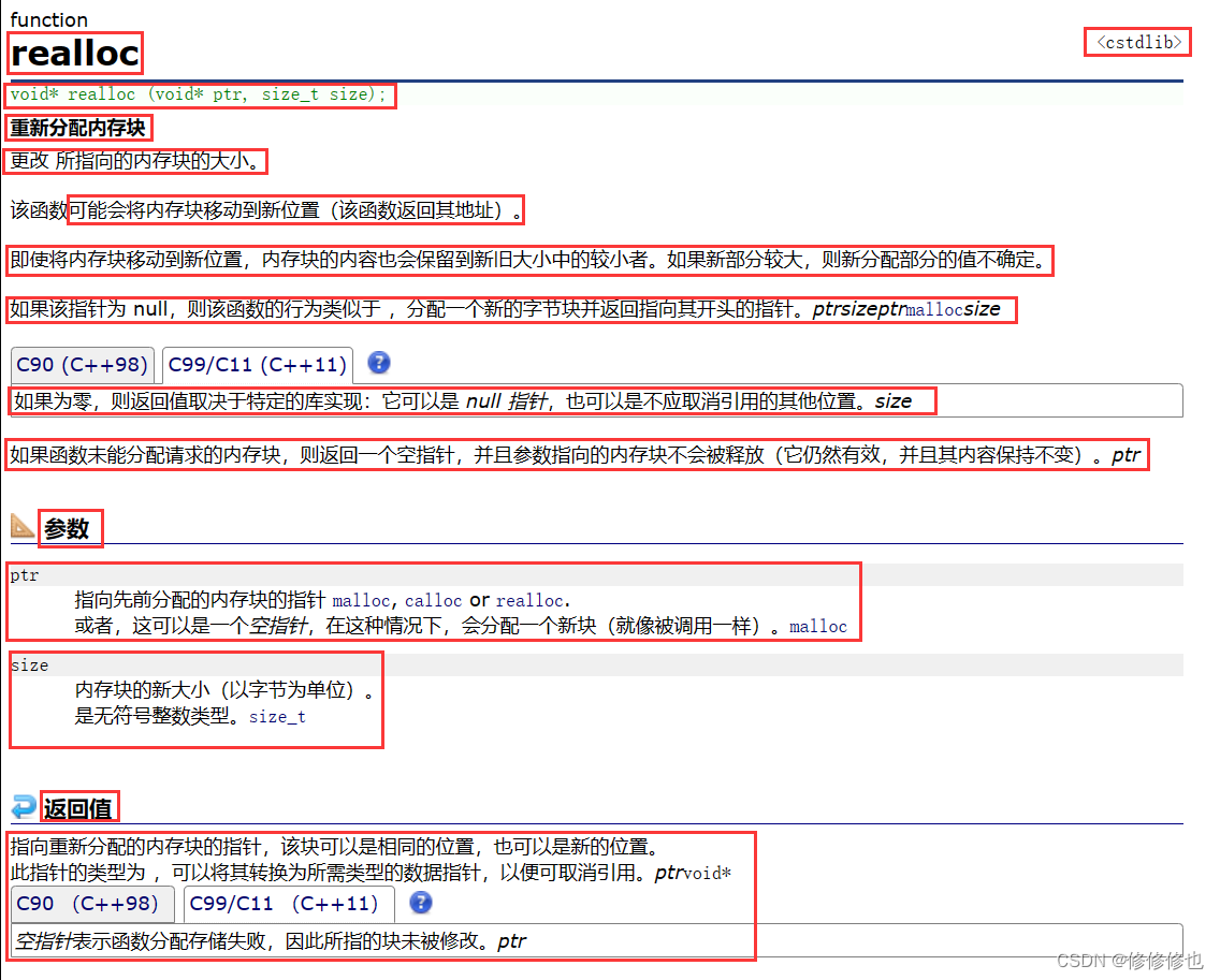 我们先来看一下cplusplus.com - The C++ Resources Network 网站上realloc()函数的基本信息: