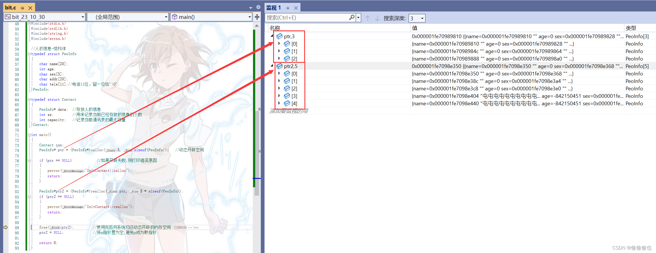 使用calloc()开辟好空间后我们使用realloc()函数将结构体数组的空间扩容到5个.