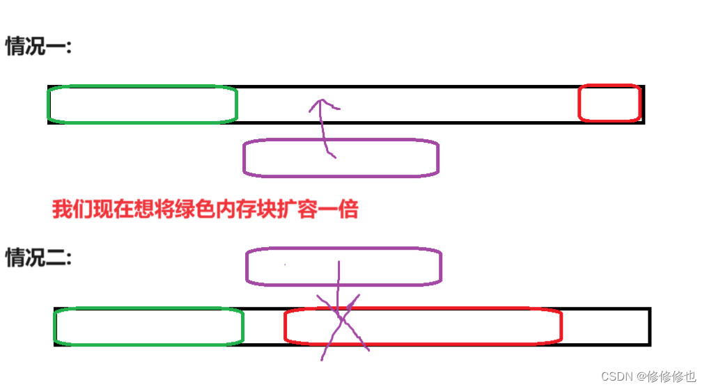 如:图中绿色空间是我们之前动态开辟的内存空间,而现在我们想使用reallo函数将它扩容一倍,