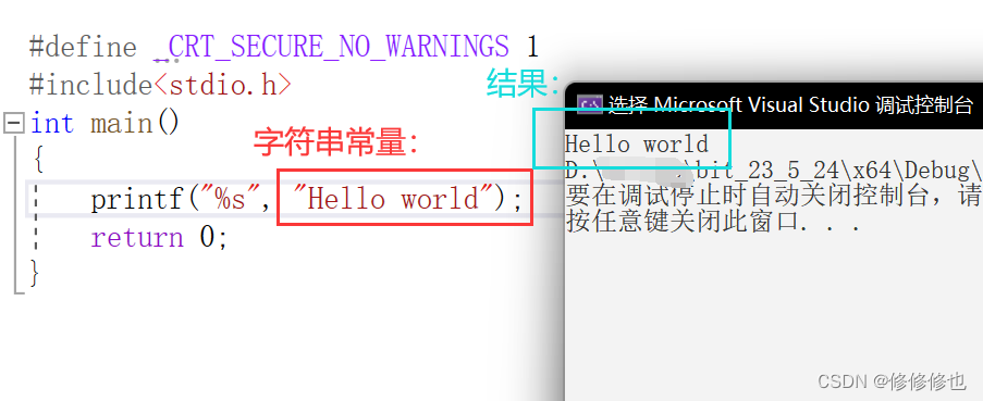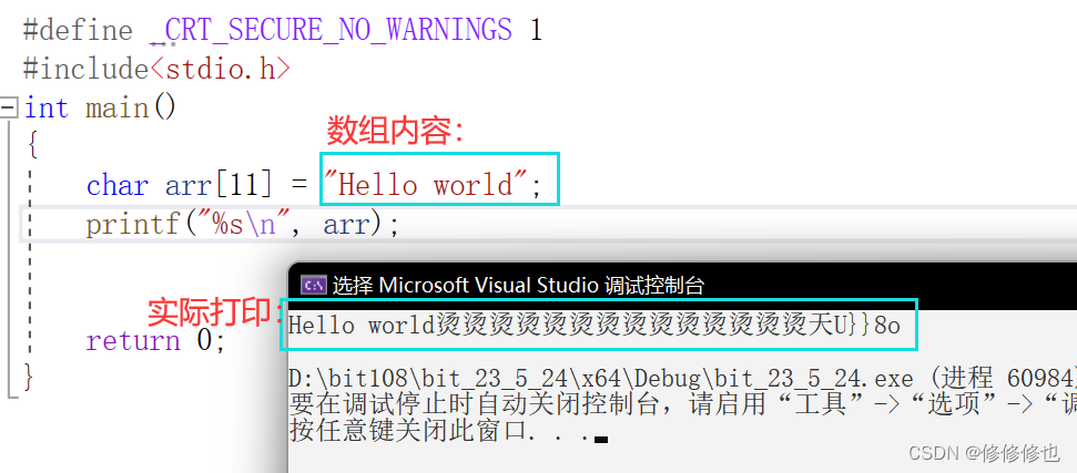 可以看到,打印的结果没有出现之前的bug现象,因此即便是字符常量,计算机也会默认帮助我们在结尾添上\0。