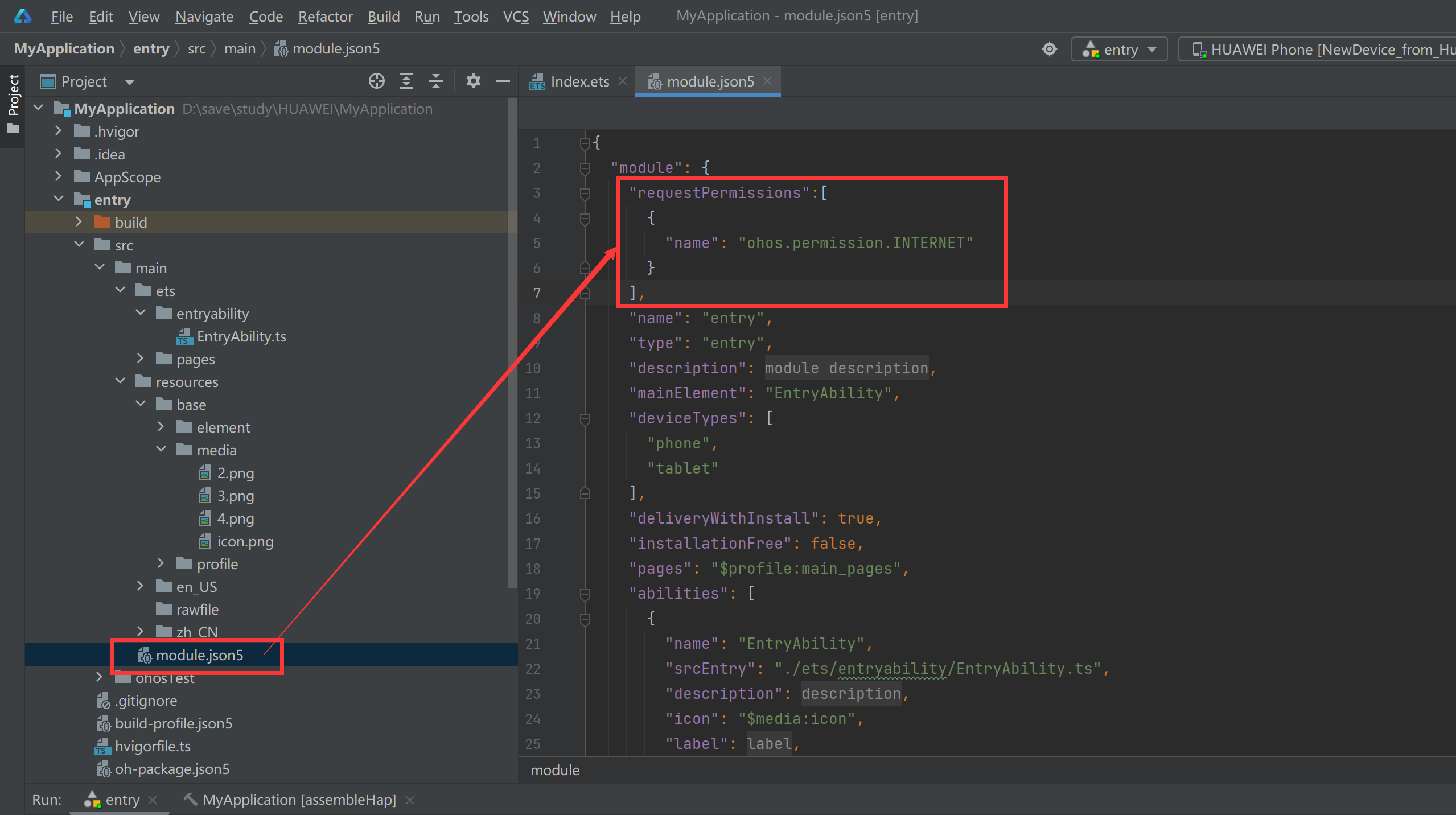 注:应用访问网络需要申请ohos.permission.INTERNET权限,因为HarmonyOS提供了一种访问控制机制即应用权限,用来保证这些数据或功能不会被不当或恶意使用。