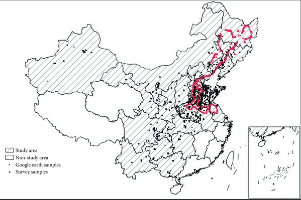 研究区域包括中国 22 个省和直辖市(斜线覆盖区域)。黑点表示从谷歌地球引擎获取的样本,红色三角形表示实地调查的样本。