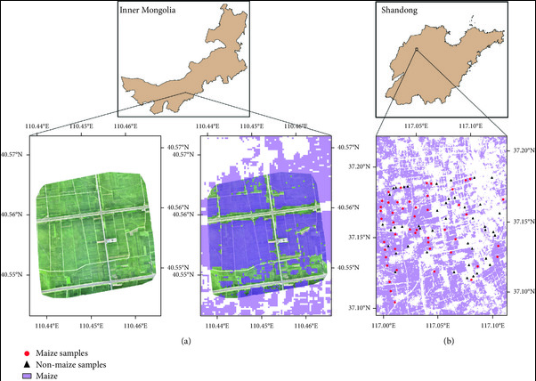 内蒙古一个无人机观测点和山东一个观测点的分类图。圆圈和三角形表示田间样本,紫色表示已识别的玉米像素。