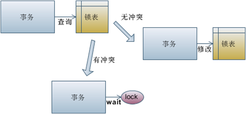 查询锁表,先判断是否存在冲突。如果无冲突,修改锁表,更新加锁信息,如果有冲突,将自己加入锁的等待队列中。锁冲突如下表所示: