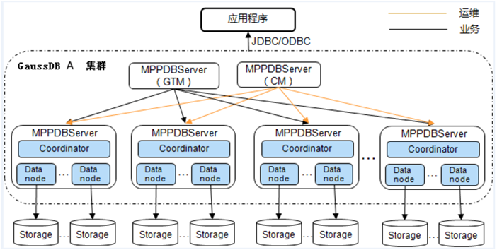 - MPPDBServer:业务模块,每个业务模块均含有Datanode(DN)进程,CN则根据需要部署在业务模块中。该模块负责执行CM、GTM下发的任务。