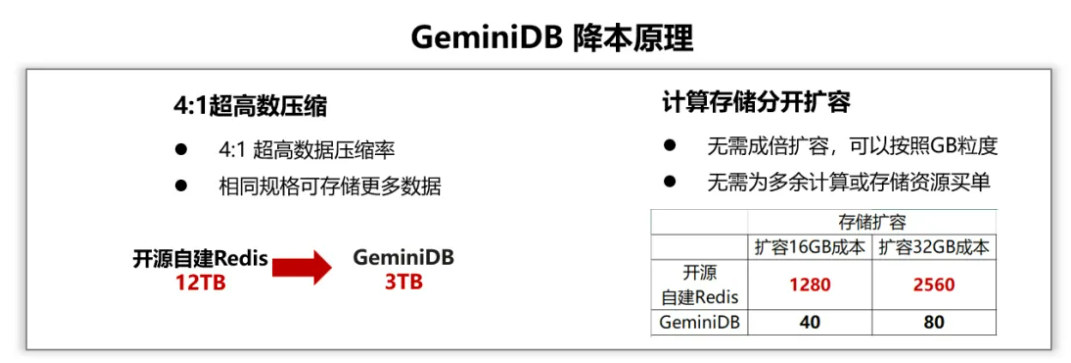 GeminiDB使用“逻辑数据+块数据”双重压缩机制,在不牺牲性能的前提下,大幅度降低数据的存储占用。同时,采用存算分离架构,将算力和数据存储解耦,支持独立弹性扩展。这意味着企业可以以更低的成本存储更多的数据,极大地优化资源利用效率,降低整体的使用成本。
