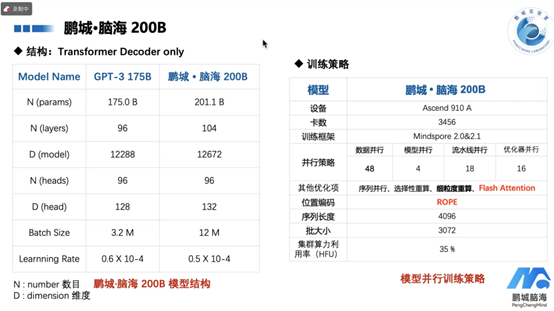 这个模型是在Ascend 910 A型号的3456张卡上进行训练的,使用了MindSpore 2.0和2.1作为训练框架。在并行策略上,采用了算子级数据并行、算子级模型并行、流水线并行以及优化器并行等多种方式,这些并行策略的组合使用使得训练过程更加高效。