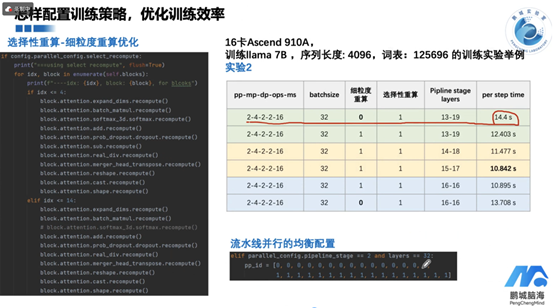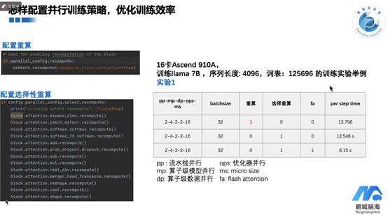 以训练llama7B模型为例,在16卡Ascend 910A上进行实验,序列长度为4096,词表大小为125696。调整batch size、是否启用重算以及是否启用选择性重算等参数,观察到了不同的训练效率。实验结果显示,合理配置并行策略和重算技术,显著减少每步训练的时间,从而提高整体训练效率。