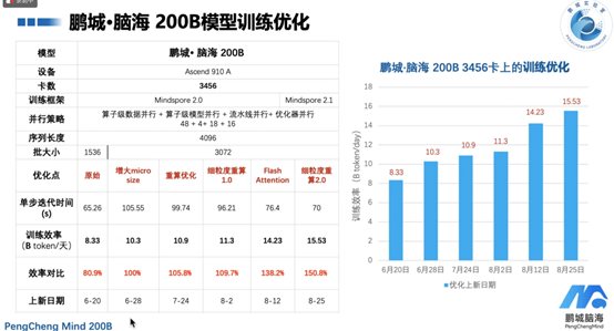 来对比一下200B模型在不同阶段的训练优化效率。从表格中看出,随着优化上新日期的推进,训练效率不断提升,达到了150.8%的提升率。这说明的优化工作是在持续进行并取得显著成效的。