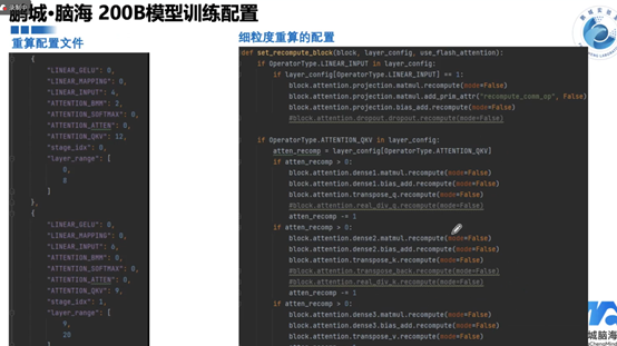 重算是一种优化技术,重新计算某些中间结果来减少内存占用,从而允许使用更大的模型或更大的批次大小进行训练。在鹂城·脑海200B模型训练中,根据模型的不同部分和层数来配置细粒度的重算策略。