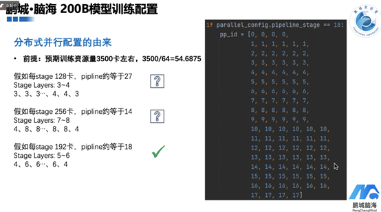 在脑海200B模型训练中,预期使用约3500张卡进行训练。为了高效利用这些资源,需要进行分布式并行配置。配置的关键在于确定每个流水线阶段的设备数量以及每层的并行策略。