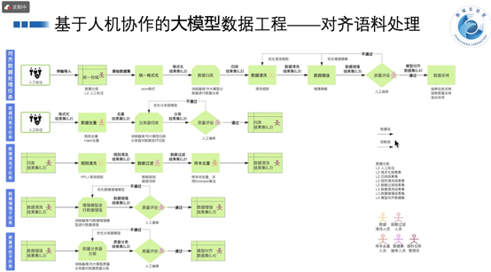 聚焦大模型数据工程中的关键步骤。在这个过程中,人机协作起到了至关重要的作用。首先要对原始数据进行处理,包括数据归类、人工标注等,以便为后续的训练和推理提供高质量的数据集。接着,会利用格式化、归一等手段对数据进行预处理,以确保数据的一致性和可比性。在此基础上,进行数据的去重和质量评估,进一步提升数据的纯净度和有效性。