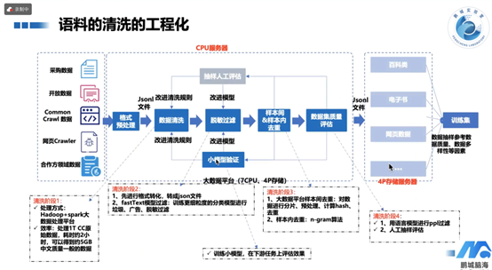 主要利用Hadoop+Spark大数据处理平台进行高效的数据处理。处理高达1T的原始数据,并在约2小时内得到约5GB的中文质量一般的数据。在这一阶段,会进行格式预处理,将数据转换为Jsonl格式,并初步制定清洗规则。