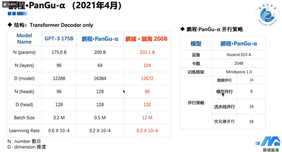PanGu-α与GPT-3在模型规模、层数、头数以及训练设置等方面的对比。与GPT-3相比,PanGu-α在模型规模上达到了200B,虽然层数相对较少,但头数较多。在训练过程中使用了更大的batch size和不同的学习率,以适应的模型和训练数据。
