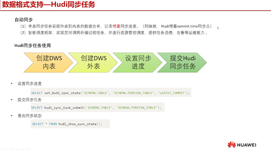 在使用Hudi同步任务时,创建DWS内表和DWS外表,然后设置同步提交Hudi进度同步任务。调用相应的SQL函数来设置同步状态、提交同步任务以及查询同步状态。