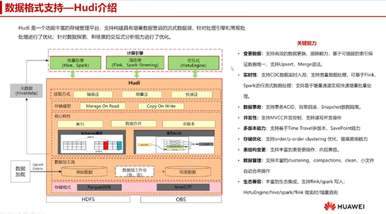 Hudi的核心能力包括元数据管理、数据加载、Upsert和Delete操作的支持,以及针对批量处理(如Hive、Spark)和流式处理(如Flink、Spark Streaming)的优化。它还支持交互式查询引擎,如HetuEngine。