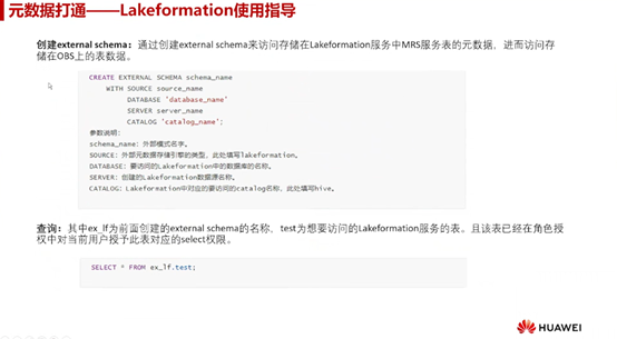创建完LakeFormation数据源连接后,通过创建external schema来访问存储在Lakeformation服务中MRS服务表的元数据,进而访问存储在OBS上的表数据了。创建external schema的语法如下: