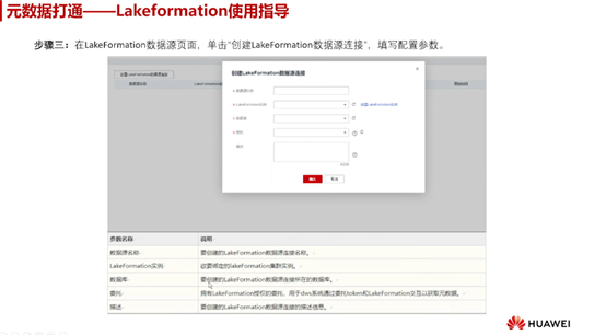 第三步,在Lakeformation数据源页面,单击“创建LakeFormation数据源连接”,并填写配置参数。这些参数包括数据源名称、LakeFormation实例、数据库、委托等。