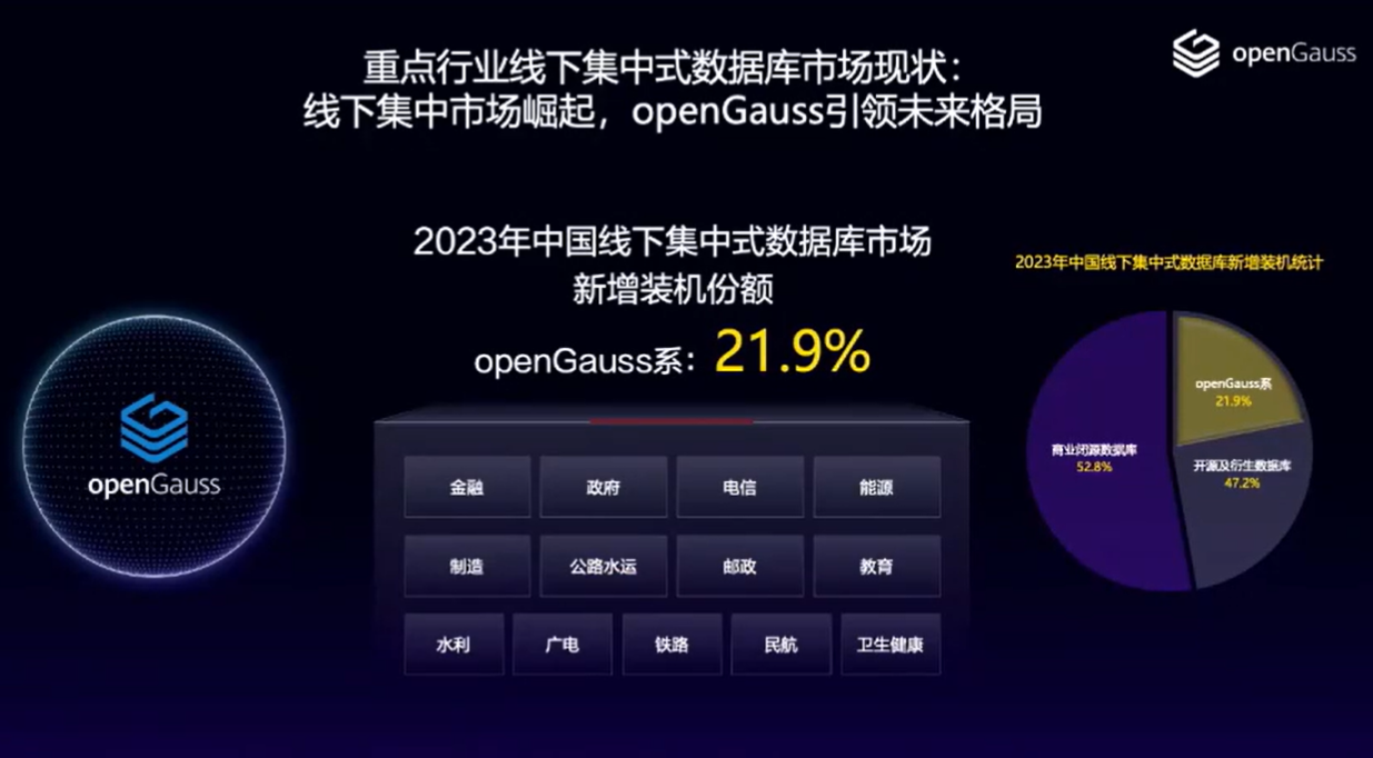 技术发展方面,得益于产业链共建、共享、共治,openGauss 在产业、生态、技术、商业四个方向取得了令人瞩目的好成绩,不断保持澎湃的创新动力。2023 年线下集中式新增市场份额达到 21.9%,从拓展期正式进入快速发展期。