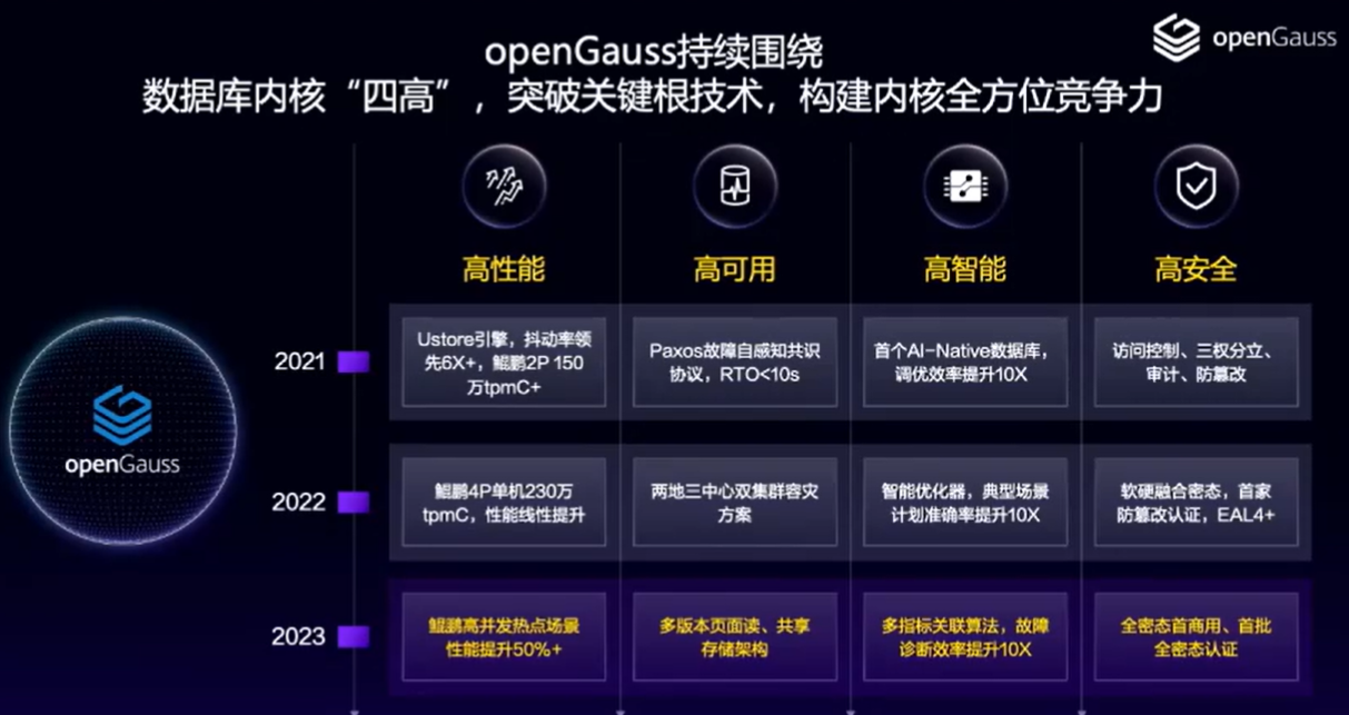 毋庸置疑的是,openGuass想要打造的是一个满足企业苛刻要求的“四高”开源数据库,需要有“高性能、高可用、高智能、安全可信”来支撑。