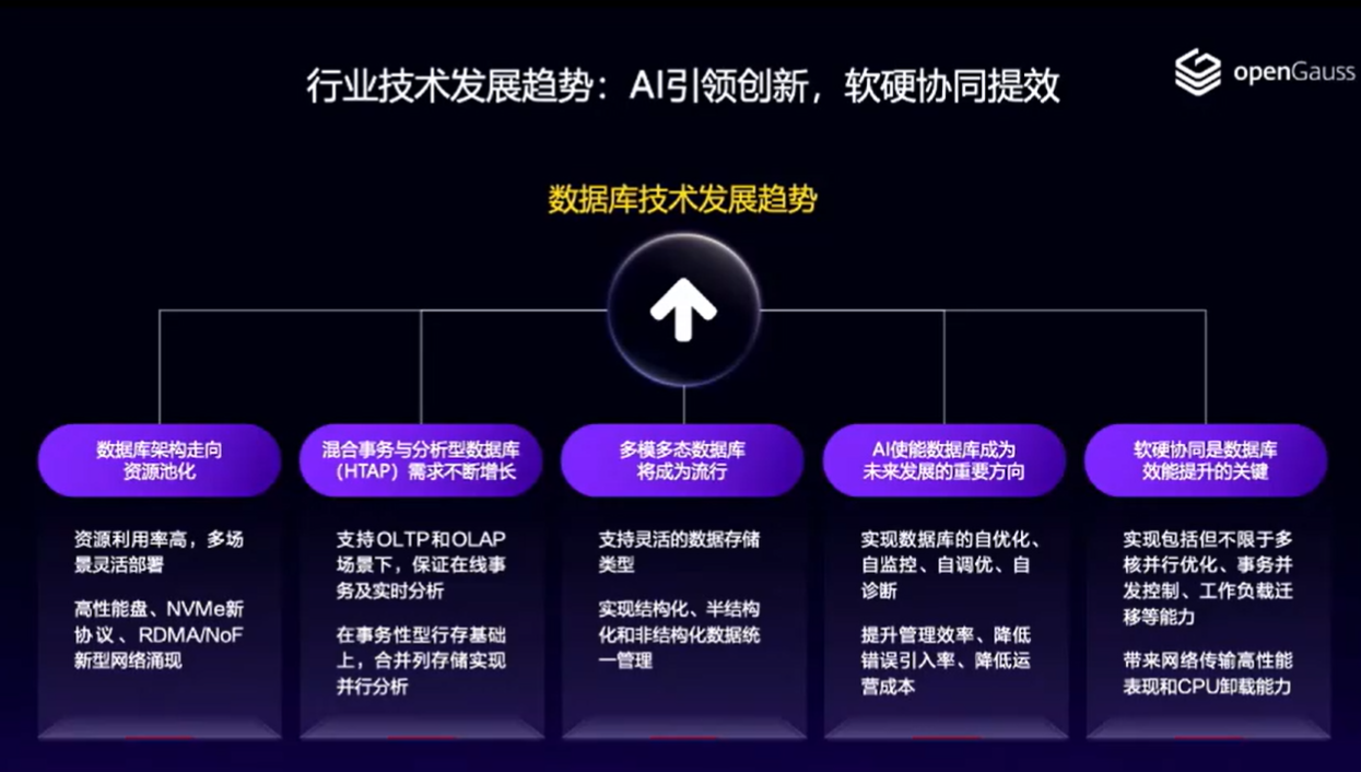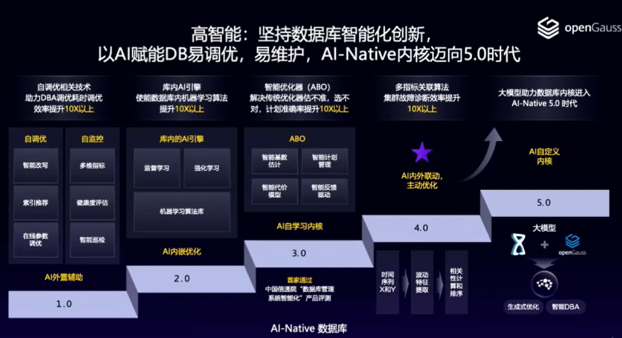 在 DB for AI 方面,从 2.0 版本开始,openGauss开始支持库内原生 AI 算子,经过多次版本演进,openGauss联合伙伴升级为支持向量引擎,开始从简单的支持机器学习应用升级为支持大模型应用。在 AI for DB 方面,从1.0版本支持 DBMind,到 3.1 版本支持 ABO 优化器,未来将会融合大模型和DataKit 插件化架构openGauss在数据库内核方面持续升级,为实现从“GUI 操作”升级到“自然语言交互”,从“自动化解决单点问题”进化为“自主解决系统性问题”。