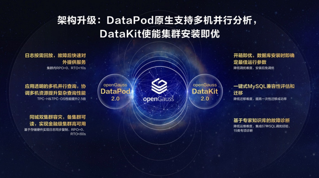 DataPod通过软硬协同,多机并行等全栈优化方案,全面提升集群性能,实现两节点 TPCC 达到 220WtpmC,TPCH 性能提升了 2.5 倍。围绕极致可靠,结合硬件能力实现同城双集群容灾,达到 RP0=0、RTO<60s。另外,支持超过 100TB 大容量处理。同时,内置原生 AI 能力,支持向量化数据存储,打造大模型数据基座。