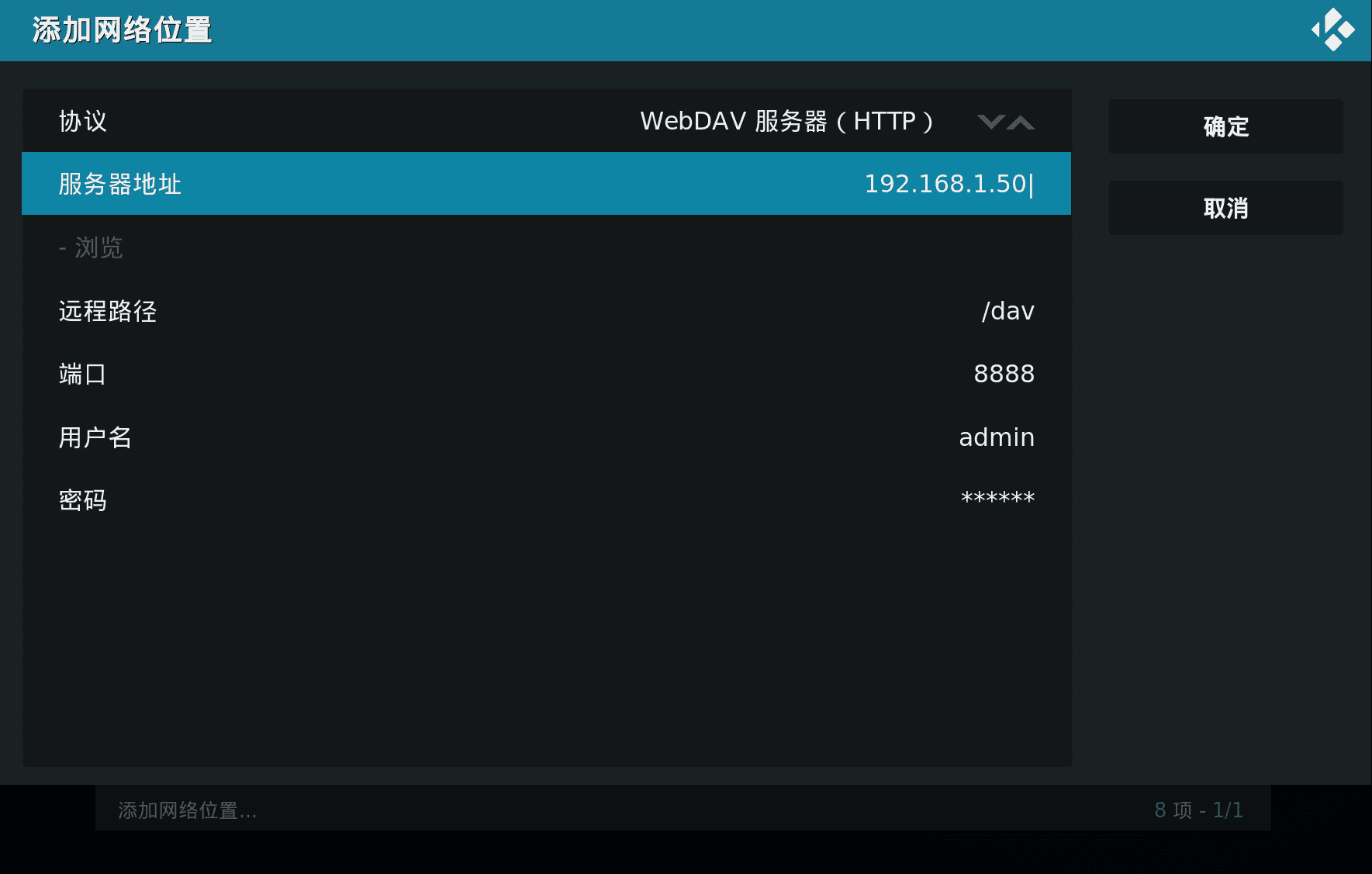 添加上相应的云盘WebDAV连接地址、账号,就可以在电视上看阿里云盘中的电影、视频资源了。