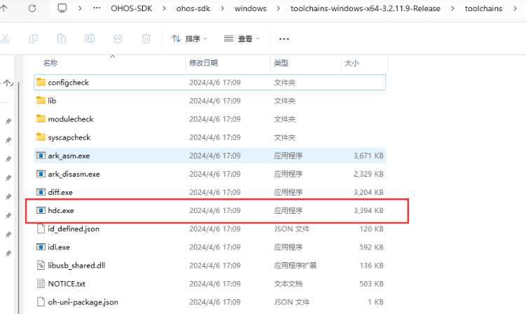 在解压后的 toolchains-windows 开头的文件夹 \toolchains 目录下,找到 hdc.exe。