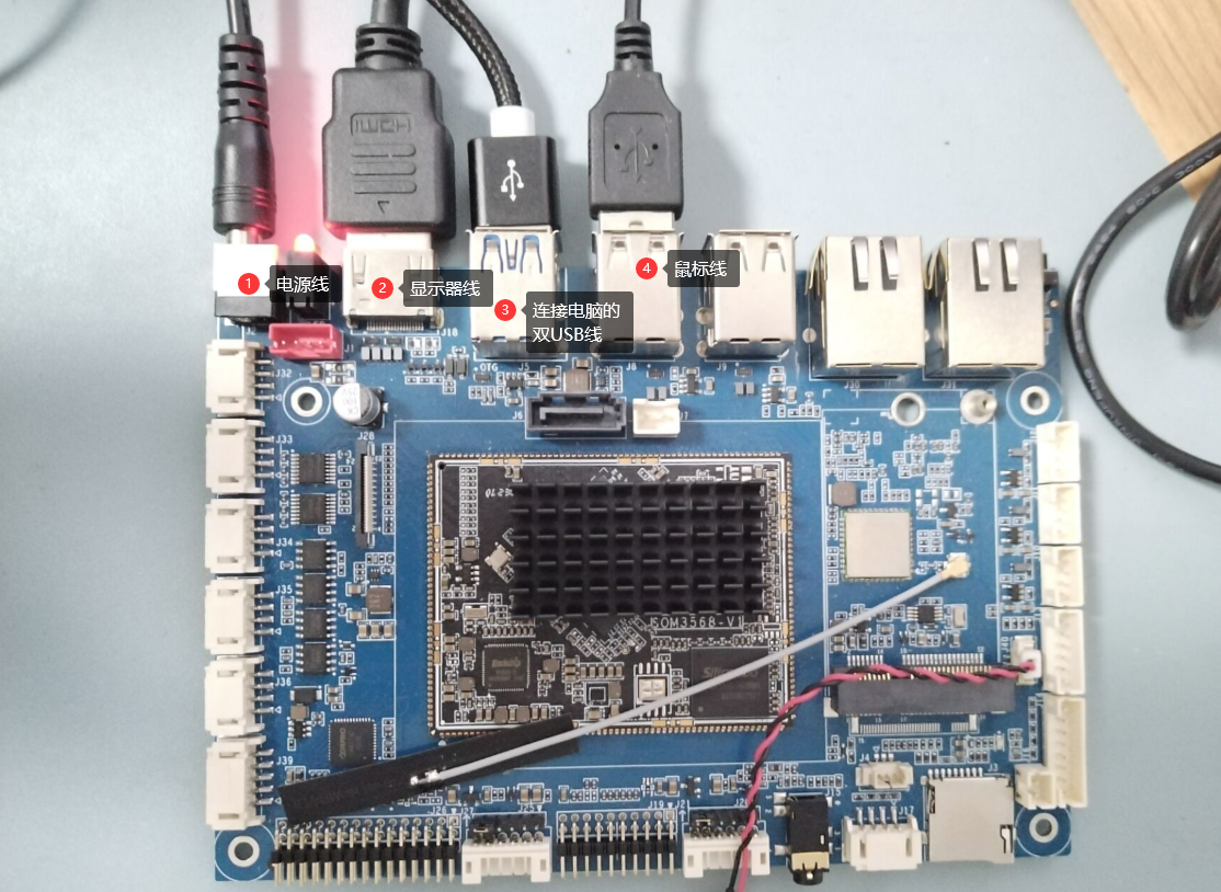 我们给开发板接好电源,连接显示器和鼠标,然后USB连接我们的电脑。