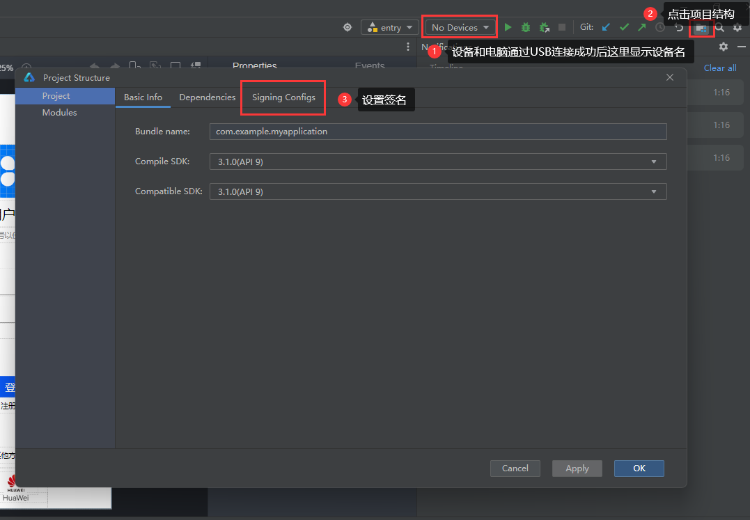 连接成功后,DevEco-Studio 上方可以看到我们的设备名,如果线没有插好,则还是显示 No Devices。